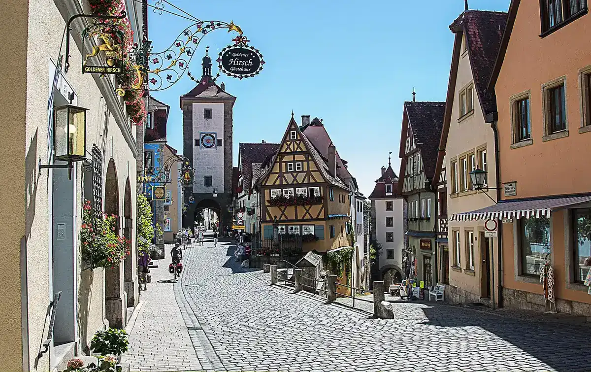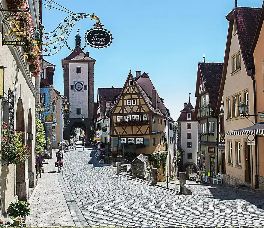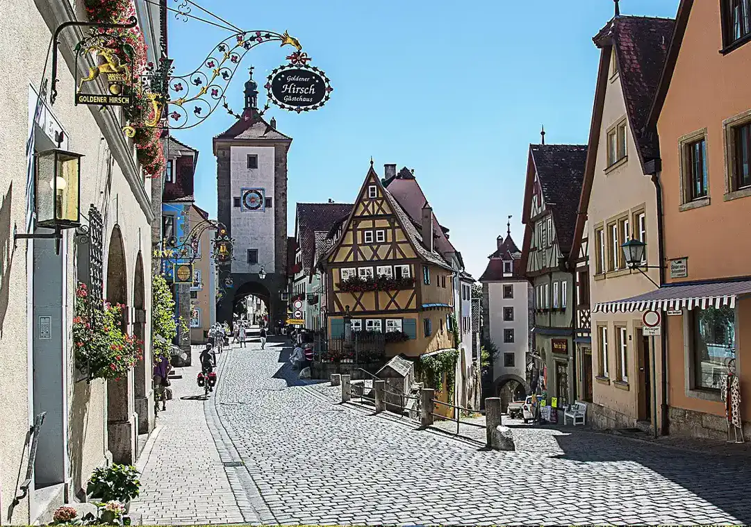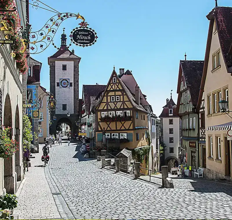 Rothenburg ob der Tauber ist ein lebendiges Zeugnis mittelalterlicher Geschichte. Die gut erhaltene Altstadt thront malerisch über dem Taubertal. Fachwerkhäuser und Stadtmauer prägen das Bild. Probieren Sie unbedingt die regionale Spezialität „Schneeballen“.